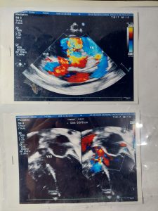 Datang ke tempat praktek Dokter Royke pada tanggal 10 Agustus 2021, dengan keadan pada tubuh ada biru-biru dan mudah terkejut. Diagnosis oleh dokter anak adalah Bocor Jantung. Diberikan oleh dokter anak Captopril 3×0,3 mg/kg BB.